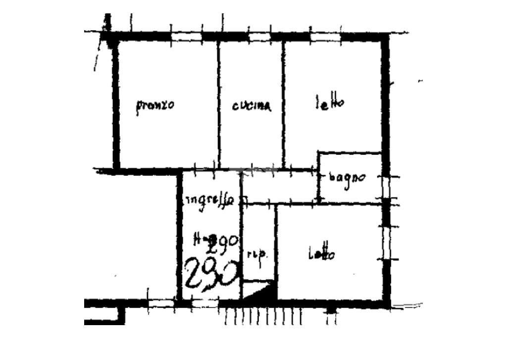 Ampio ingresso, salotto, cucina abitabile, disimpegno notte, ripostiglio, due camere da letto, bagno e balcone.